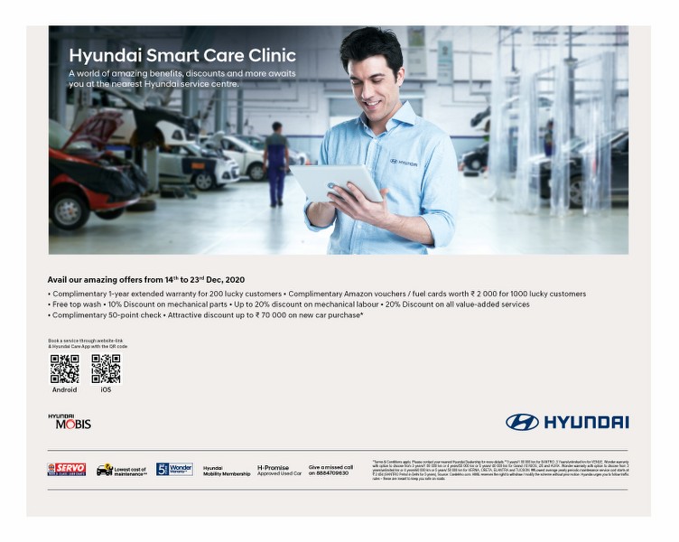 Hyundai Motor India Ltd. (HMIL), today announced the launch of ‘Hyundai Smart Care Clinic’, a 10 day Nationwide Service Camp for customers from 14th to 23rd Dec ’20, at 1288 Hyundai Service points across India.
